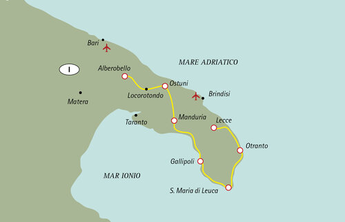 Die Stadt der Trulli bleibt hinter Ihnen zurück, während Sie durch die letzten Ausläufer der Murgia radeln und die ländliche Landschaft genießen. Gerade rechtzeitig für eine kleine Kaffeepause erreichen Sie Locorotondo, mit seiner runden Anlage und den steilen Giebeldächern seiner Häuser eines der schönsten Dörfer Italiens. Schon wenige Kilometer weiter erwartet Sie Cisternino mit einem schwierigen Aufstieg zum Ortszentrum – belohnt werden Sie durch den Charme dieser einzigartig verwinkelten uralten Straßen. Hier haben Sie alle Zeit, um sich auszuruhen, sich vielleicht mit ausgezeichneten Taralli und Friselle einzudecken oder natürlich einen ordentlichen Teller Orecchiette zu verspeisen. Heutiges Etappenziel ist Ostuni, das als „die weiße Stadt“ bekannt ist: Genau so wird Ihnen diese strahlende Schönheit auf ihrem Hügel mit Meerblick in Erinnerung bleiben.