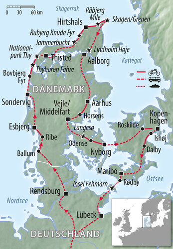 Dänemark ist absolut einen Besuch mit dem Fahrrad wert. Sie erleben auf dieser Reise einsame Strände, große Wälder, riesige Dünen, idyllische Bauernhöfe und zierliche kleine Schlösser. Unendliche Felder, schöne Städte und Dörfer paaren sich mit der Dänischen Gelassenheit und werden diese Reise zu einem besonderen Fahrrad-Erlebnis werden lassen.