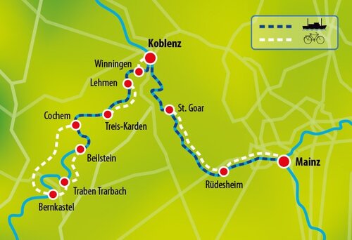 In aller Frühe legt das Schiff ab und fährt mit dem Strom flussabwärts. Frühaufsteher genießen die herrliche Landschaften des Oberes Mittelrheintal durch die sie zuvor mit dem Rad gefahren sind. Bei Koblenz fährt das Schiff am Deutschen Eck ins Tal der Mosel bis zur Schleuse Lehmen. Um die Mittagszeit startet hier Ihre heutige Radtour entlang der Mosel. In Moselkern fahren Sie durchs Elzbachtal den Berg hoch. Sie können den letzten Abschnitt auch zu Fuss zurücklegen. Das Ziel ist die schöne Höhenburg Eltz aus dem 12. Jahrhundert, eine der bekanntesten ihrer Art in Deutschland. Über Moselkern und Müden führt der letzte Abschnitt der Radtour ins Winzerdorf Treis-Karden.
