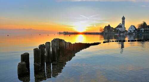 Am Morgen starten wir die Radtour in der hübschen Kleinstadt Markdorf (Transfer von Überlingen: 22 km). Für die Route nach Lindau hat terranova Strecken gewählt, die auf versteckten Wegen entlangführen. Dabei fahren wir vorbei an alten Obstbauernhöfen, sehen kleine Dörfer, durchqueren Wäldchen und passieren einen malerisch gelegenen, kleinen See. Dann senkt sich die Landschaft zum Bodensee hinab und wir fahren hinunter nach Wasserburg. Tatsächlich kann man dort die Reste einer Burg erkennen: Es ist eine Zinnenmauer, an welche die Wellen des Bodensees plätschern. Sie umgibt einen schön gelegenen Friedhof und eine Kirche, deren Zwiebelturm zu den meistfotografierten Motiven am See gehört.