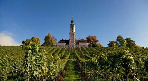 Wenn Sie vom Frühstücksbuffet kommen, stehen die Räder schon aufgereiht neben dem Hotel und sind zur Abfahrt bereit. Die Radstrecke beginnt mit einer leichten Abfahrt und verläuft leicht hügelig auf Wegen abseits der Landstraße. Es folgen Wald- und Wiesenwege mit herrlichen Blicken auf den See. Auf ihnen radeln wir direkt bis vor die Tore der Birnau. Diese Rokokokirche ist fast zum Symbol der ganzen Bodenseelandschaft geworden und gehört zu ihren meistbesuchten Kostbarkeiten. Vor der Kirche erstreckt sich eine Balustrade, von der aus Sie einen prächtigen Blick auf den See genießen.