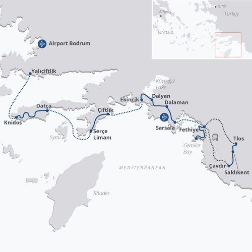 Diese Reise findet abwechselnd von Yalıҁiftlik (Bodrum) nach Fethiye und von Fethiye nach Yalıҁiftlik (Bodrum) statt (siehe Reise-Termine). Der Einschiffungshafen Yalıҁiftlik (Bodrum) ist am einfachsten per Fluganreise zum Flughafen Bodrum (BJV) erreichbar. Für die Anreise nach Fethiye empfiehlt sich der nächstgelegene Flughafen Dalaman (DLM).
